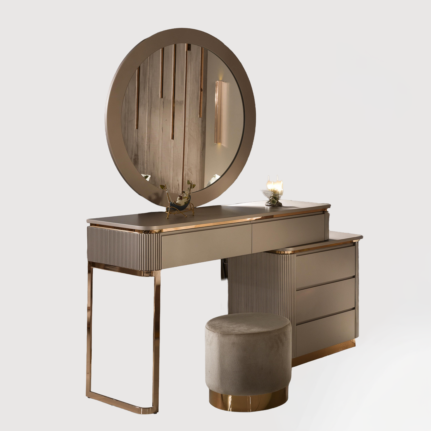Ferhat Berbercan Mobilya olarak, size Kardelen Makyaj Masası'nı sunmaktan mutluluk duyarız. Bu özel tasarım makyaj masası, yatak odalarınızda sadelik ve şıklığı bir araya getirir. Beyaz rengi ve altın titanyum detayları ile odanıza lüks bir hava katar.