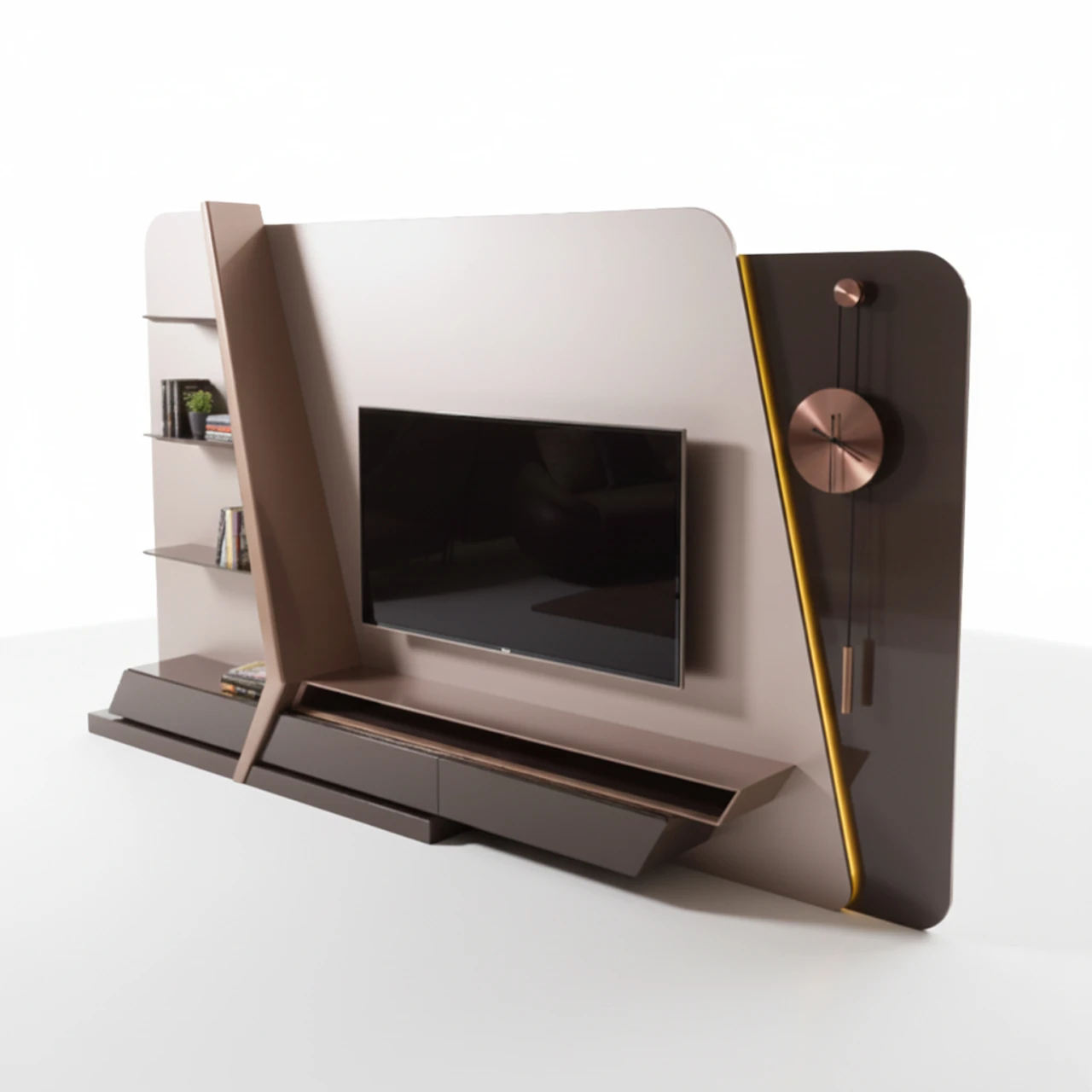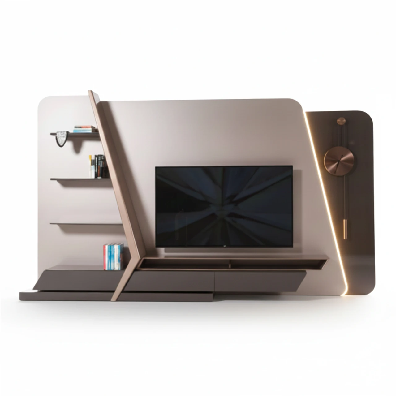 Ünitenin sağ kanadında yer alan özel tasarım entegre sarkaçlı saat, modern teknoloji ile klasik zaman algısını sofistike bir şekilde harmanlar. Sol taraftaki ince cam raflar dekoratif objeleriniz için zarif bir sergileme alanı sunarken, alt bloktaki asimetrik antrasit depolama modülleri işlevselliği estetikle birleştirir. Arka panelden süzülen gizli LED aydınlatma, mekanın atmosferini değiştirerek ürüne heykelsi bir hava katar.