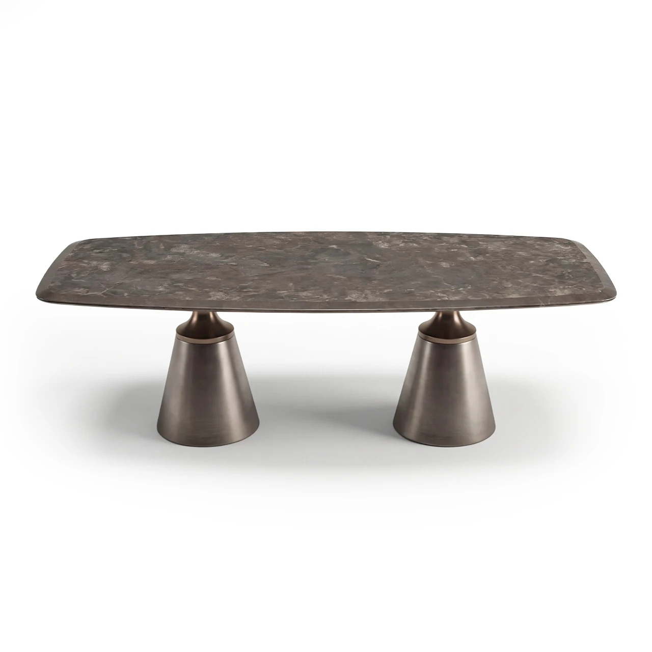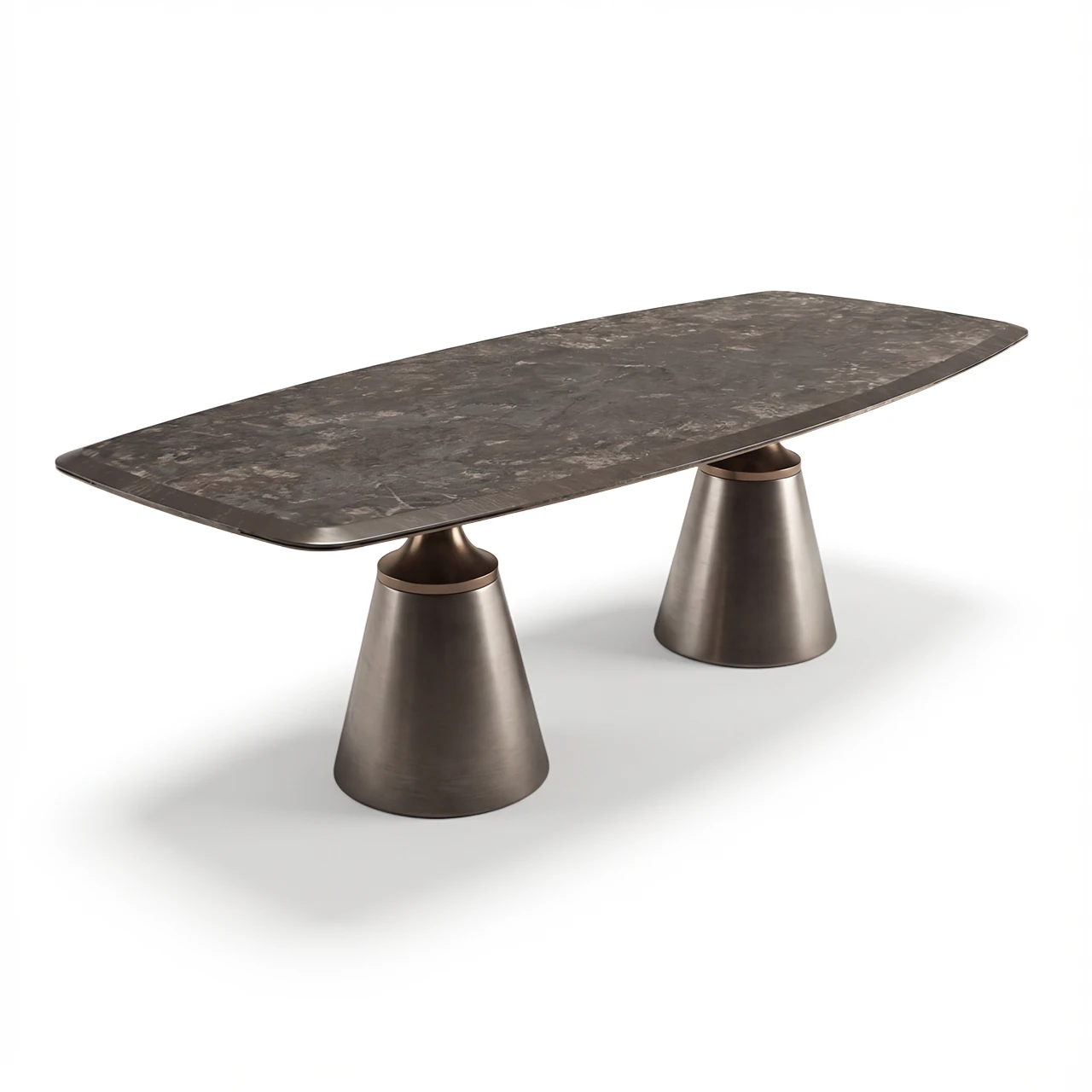 Masanın karakterini belirleyen en önemli unsur, zemine sağlam bir şekilde basan konik metal ayaklar ve onları taçlandıran bronz bilezik detaylarıdır. İtalyan tasarım anlayışını yansıtan bu lüks yemek masası, geniş yüzeyiyle kalabalık davetleriniz için ideal bir alan sunarken, geometrik formuyla modern mimarinin izlerini taşır. Hem Art Deco hem de çağdaş stillerle kusursuz uyum sağlayan Kantorin, zamansız bir şıklık arayanlar için üretildi.