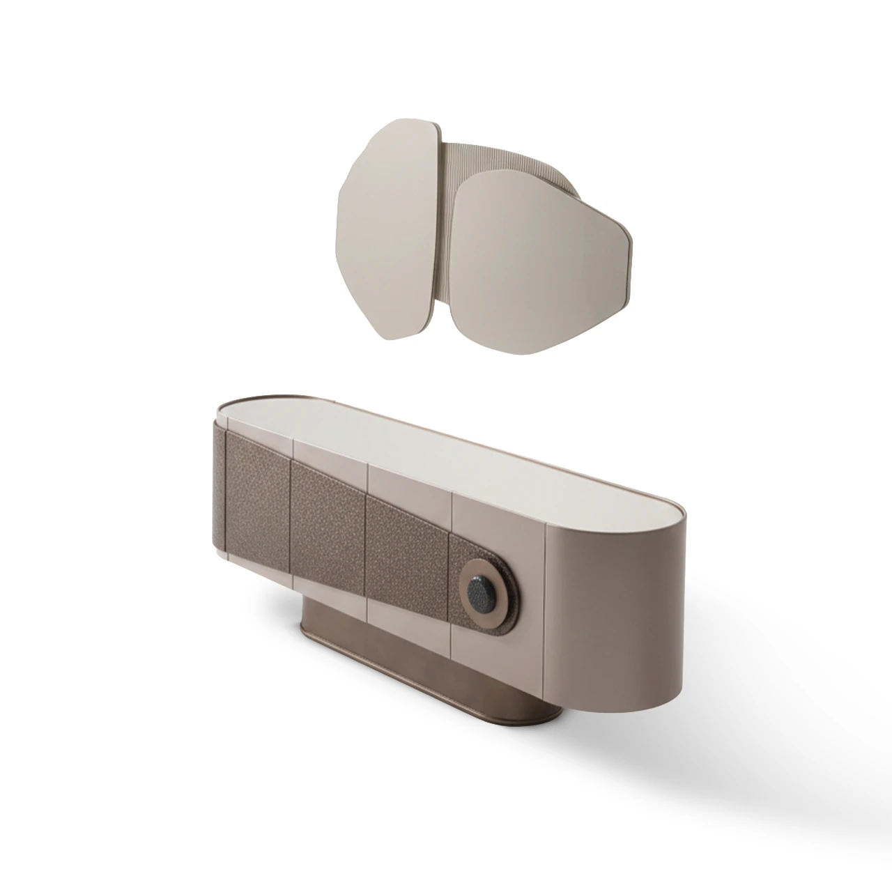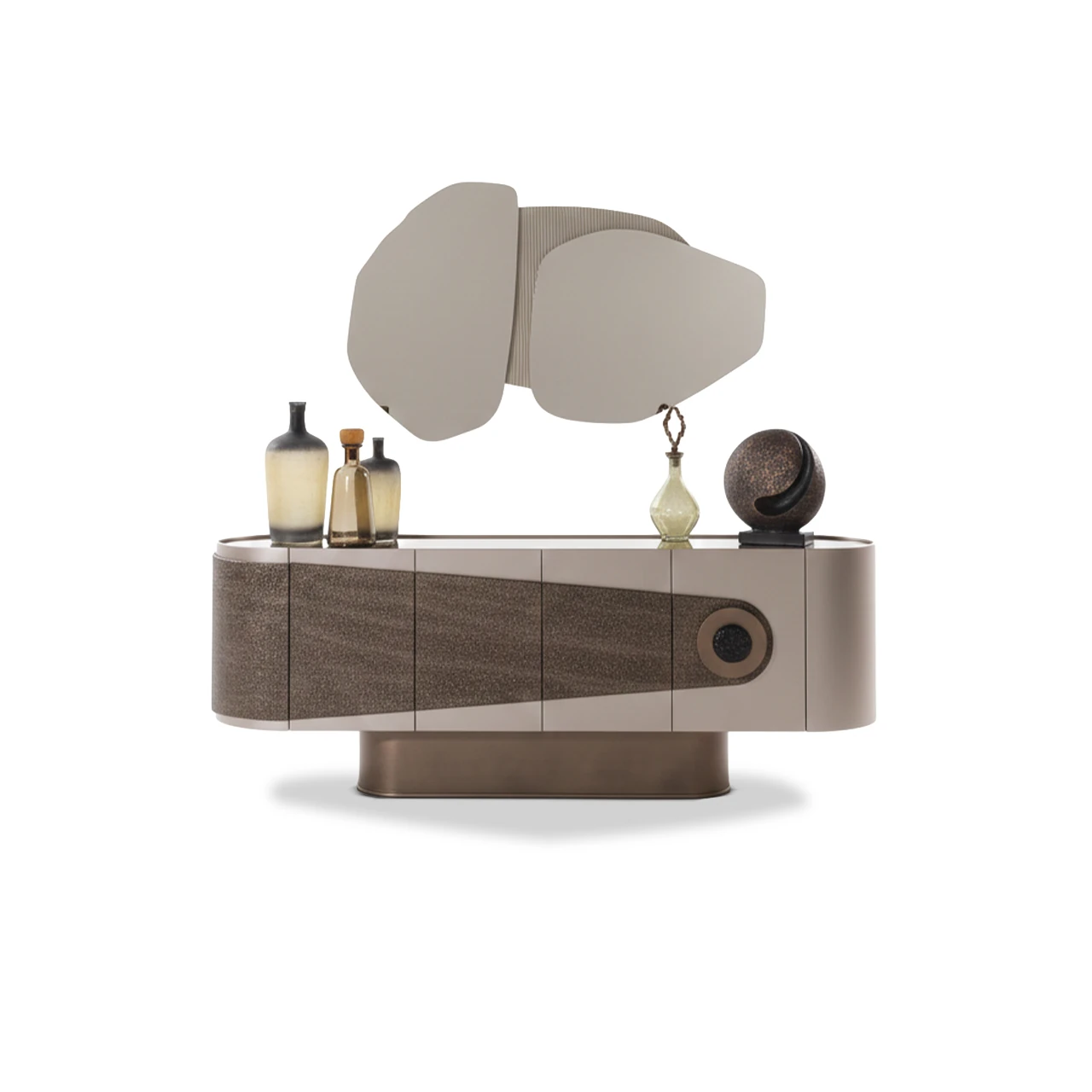 Ürünün zarafetini tamamlayan bronz metal baza, yere sağlam ve sofistike bir basış sağlarken, kulp detayındaki metal ve doku birlikteliği ustalığımızı gözler önüne seriyor. Üzerindeki amorf formlu, parçalı ayna tasarımı ise konsolu sadece bir depolama ünitesi olmaktan çıkarıp, evinizin odak noktası haline gelecek bir sanat eserine dönüştürüyor. Geniş iç hacmiyle fonksiyonelliği, birinci sınıf işçilik ile estetiği buluşturan Patara, zamansız bir şıklık arayanlar için tasarlandı.