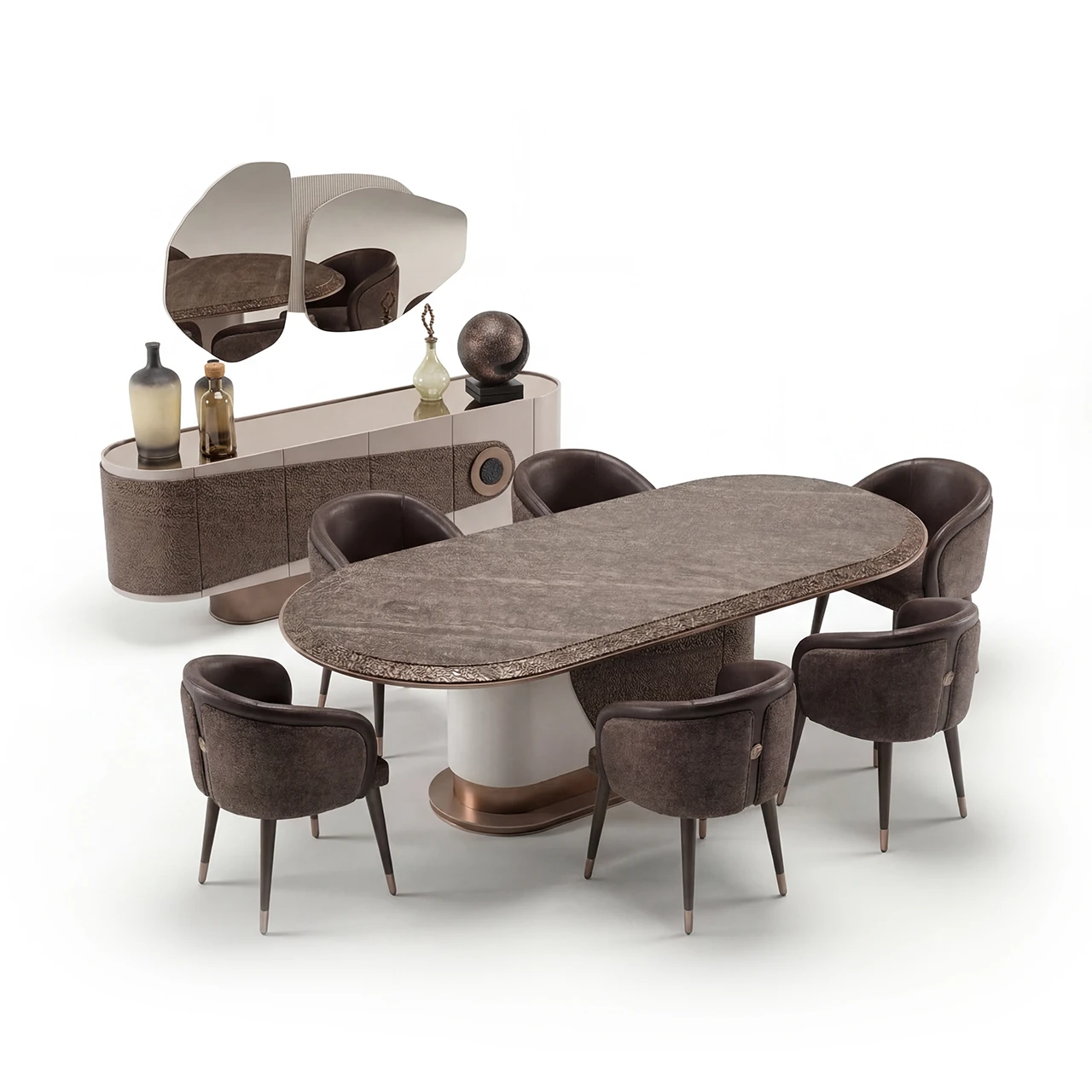 Ferhat Berbercan Patara Yemek Odası Takımı – sanatsal konsol, organik formlu ayna kompozisyonu, 6 sandalye ve yemek masası. Bronz detaylı lüks yemek odası. Villa ve rezidanslar için bespoke üretim.