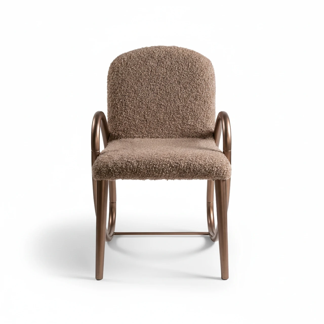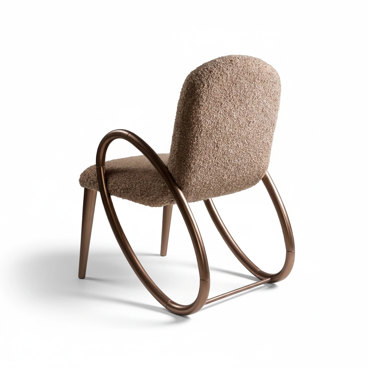 Oturum ve sırt bölgesinde tercih edilen yoğun dokulu bukle kumaş, sandalyeye hem dolgun bir görünüm hem de yumuşak bir konfor kazandırır. Ahşabın üzerindeki bronz-kahve tonlarındaki özel parlak cila, tasarıma ışıltılı ve sofistike bir hava katarken, kavisli hatlar mekana akıcı bir enerji verir. Sıradan ayak yapısının aksine, bir bütün halinde yere uzanan bu dairesel tasarım, lüks yemek odası takımları için eşsiz bir tamamlayıcıdır.