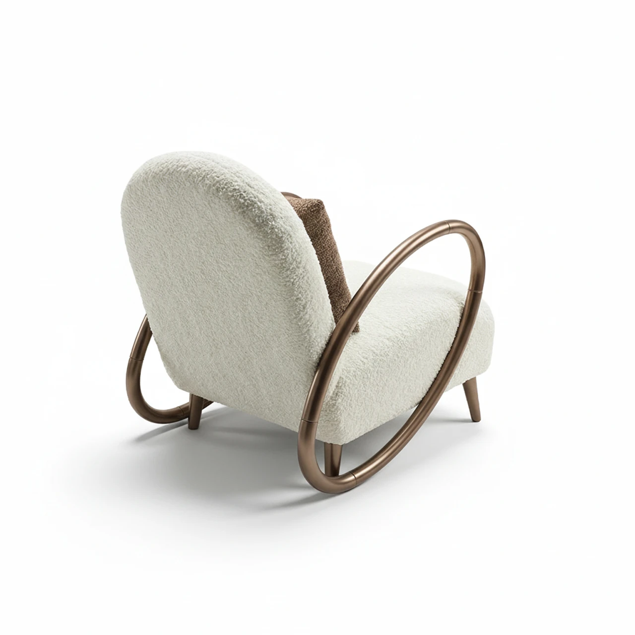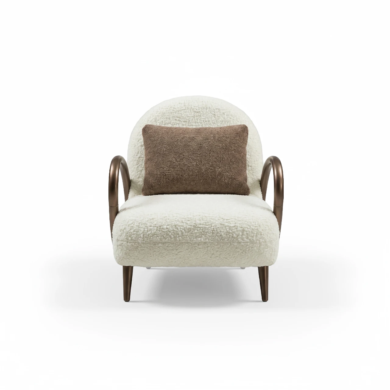 Trendleri belirleyen ithal bukle (teddy) kumaş döşemesi, dokunma duyusuna hitap eden sofistike bir deneyim sunar. Ergonomik kavisli sırt yapısı ve tasarımı tamamlayan kontrast bel yastığı, uzun süreli oturumlarda bile maksimum konfor sağlar. Ahşap işçiliğinin İtalyan tasarım estetiğiyle buluştuğu bu parça, salonunuzda benzersiz bir odak noktası yaratmak için tasarlandı.