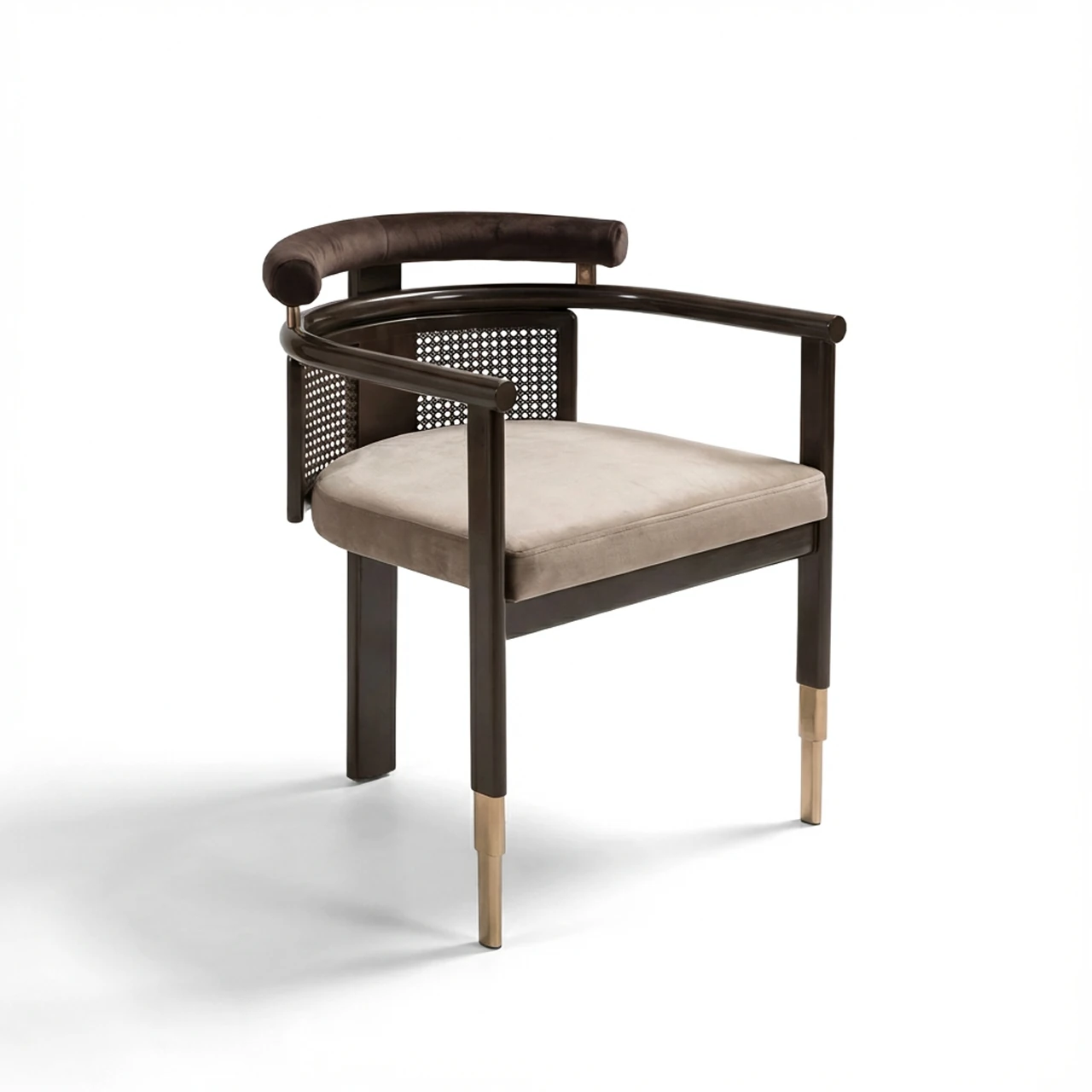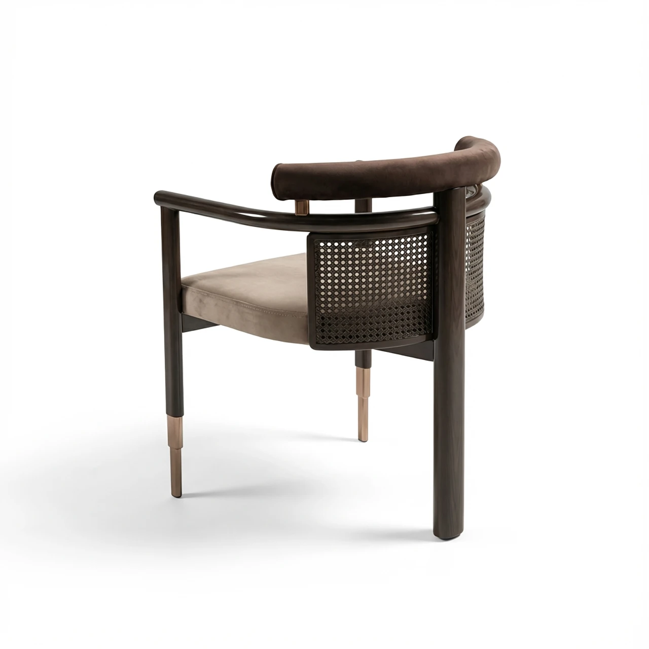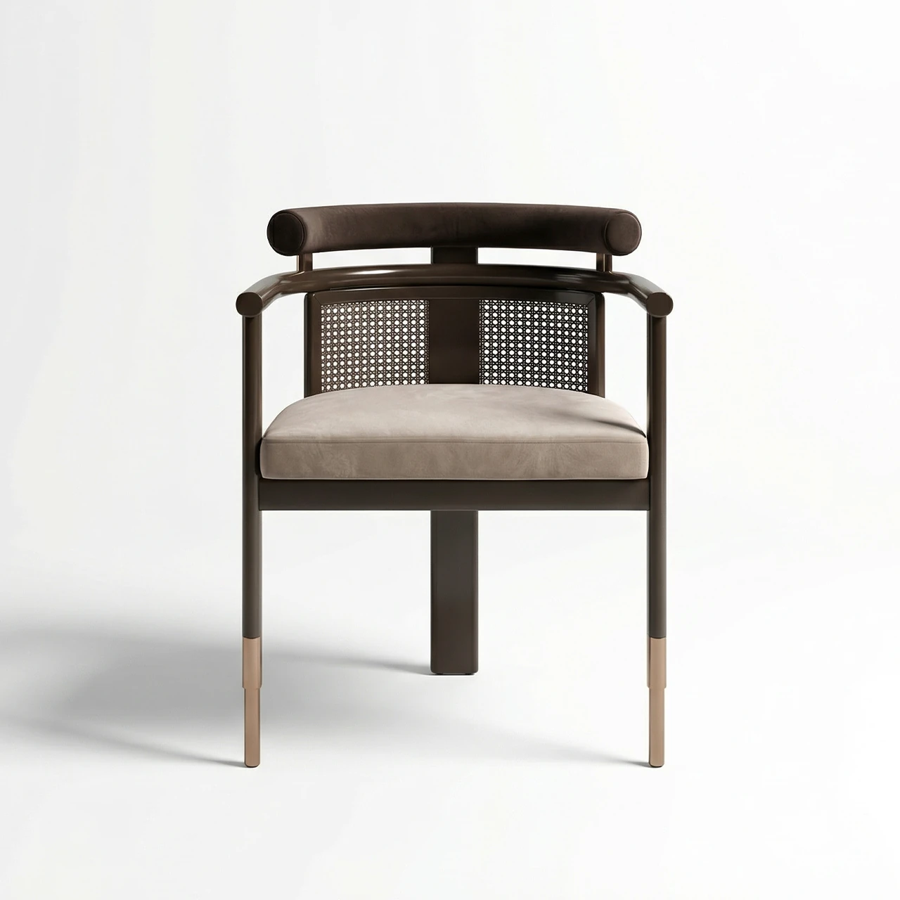 Ferhat Berbercan Mobilya kalitesiyle hayat bulan bu özel tasarım, retro stili modern yaşam alanlarına sofistike bir dokunuşla taşıyor. Sırt kısmındaki doğal ve zarif hazeran örgü (kenevir) uygulaması, tasarıma derinlik ve nefes alan bir yapı kazandırırken; kavisli sırt bloğu vücudu saran ergonomik bir konfor sunar. Oturum ve sırt desteğinde kullanılan birinci sınıf nubuk dokulu kumaş, yumuşak tuşesiyle lüksü hissettirir. Gövdenin koyu ceviz tonlarındaki kusursuz cilası ve ayak uçlarındaki parlak patik detayları, ürüne mücevher niteliğinde bir bitiş sağlayarak “bespoke” mobilya ayrıcalığını vurgular.