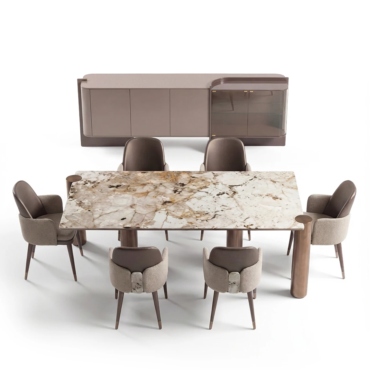 Türkiye’nin lüks mobilya sahnesinde fark yaratan Ferhat Berbercan’ın bespoke üretim anlayışıyla şekillenen Safir Yemek Odası, İtalyan tasarım estetiğini çağdaş Türk zanaatkârlığıyla harmanlayarak yemek alanınıza prestijli bir kimlik kazandırır. Modern villa, rezidans ve geniş daireler için ideal olan bu takım, misafirlerinizi ağırlarken zarif bir atmosfer yaratır.