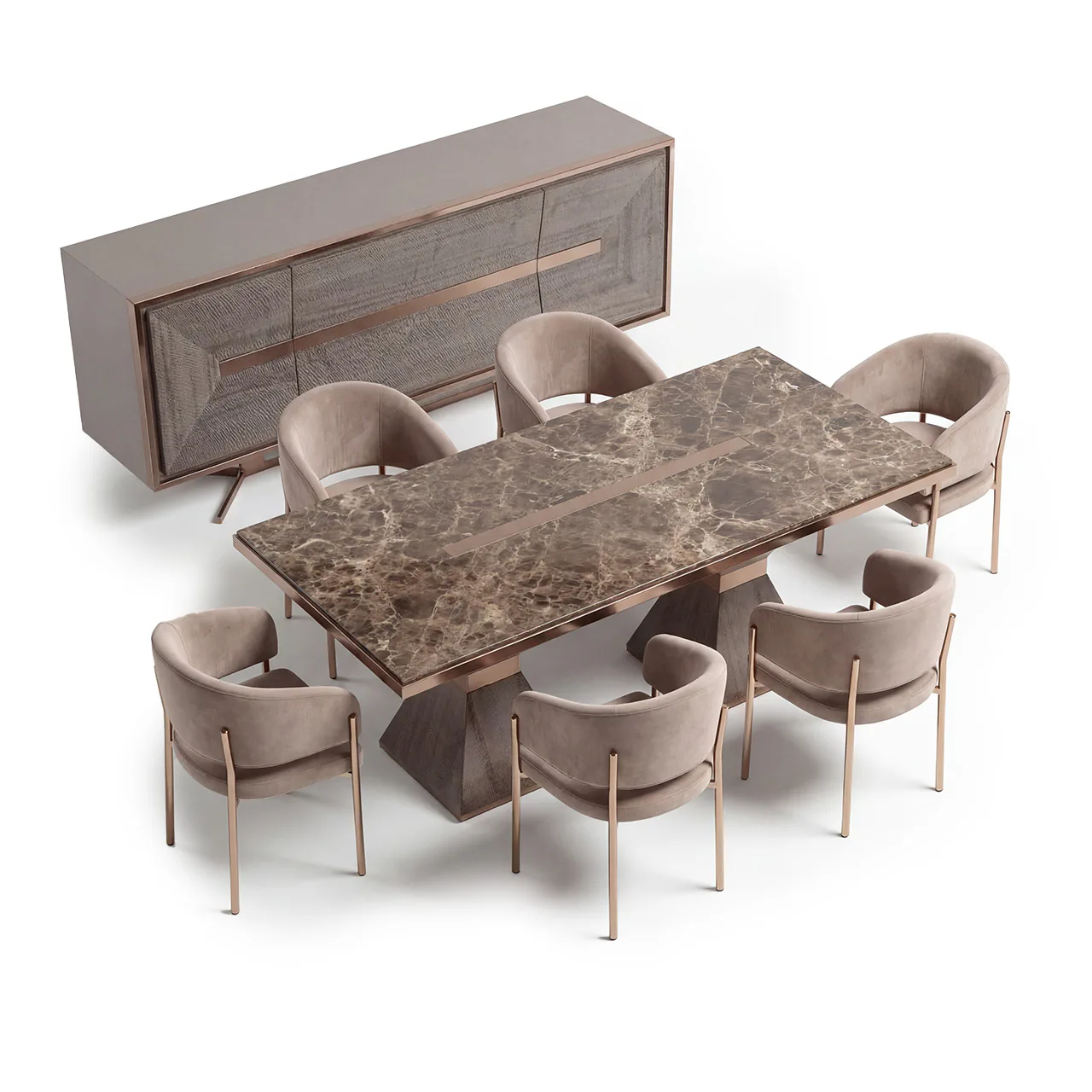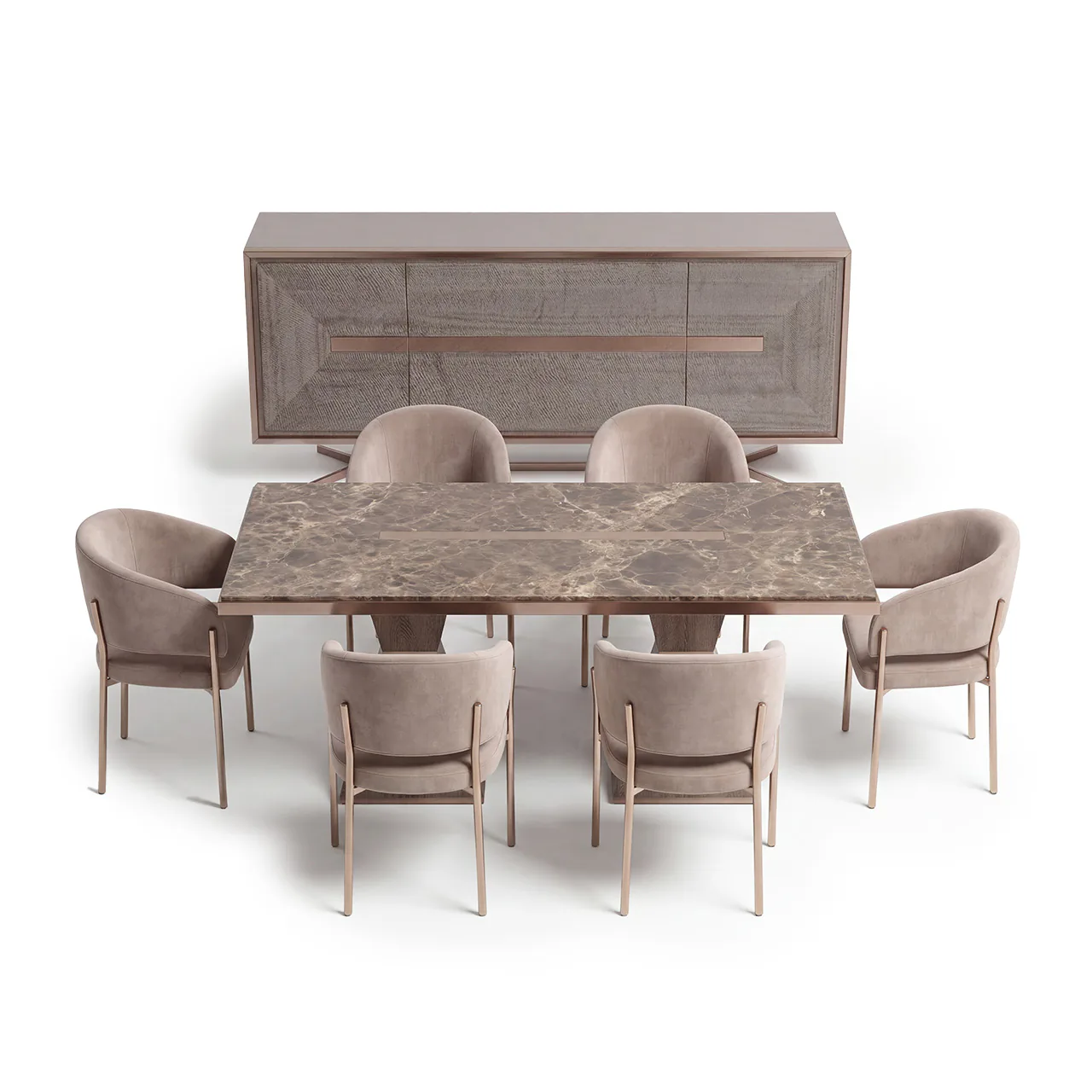 Venedik Yemek Odası, Venedik koleksiyonunun modern tasarım anlayışıyla üretilmiş bir yemek odası grubudur. Masa, konsol ve sandalyelerden oluşan bütünleşik kompozisyonuyla yemek alanına uyumlu bir düzen sunar. Koleksiyonun diğer parçalarıyla birlikte kullanıldığında mekânda bütünlüklü bir görünüm oluşturur. Günlük kullanım ve özel davetler için uygun, işlevsel bir tasarımdır.