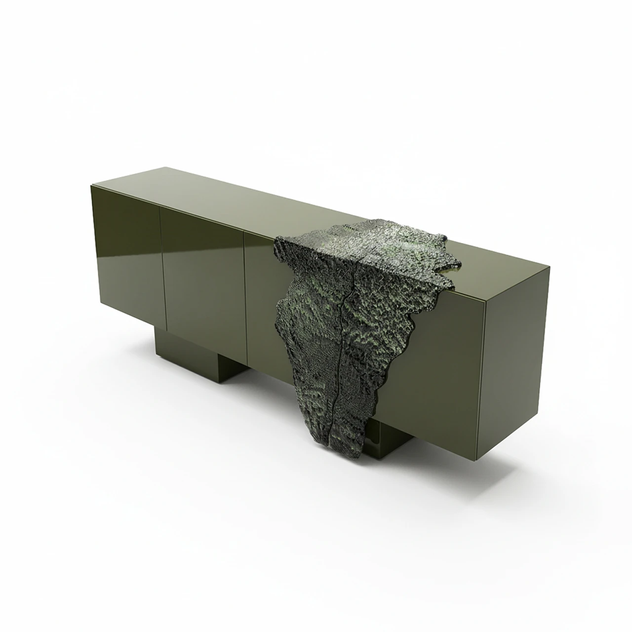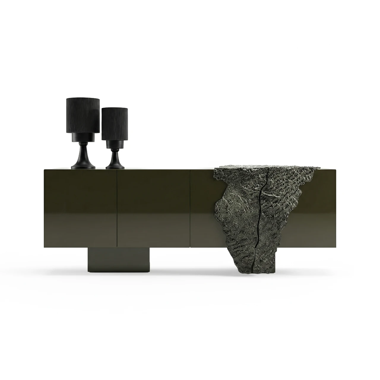 Kusursuz high-gloss lake yüzeyin, heykelsi ve ham dokulu sanatsal bir formla buluştuğu Verde Konsol; zıtlıkların uyumuyla modern lüksü yeniden tanımlıyor.