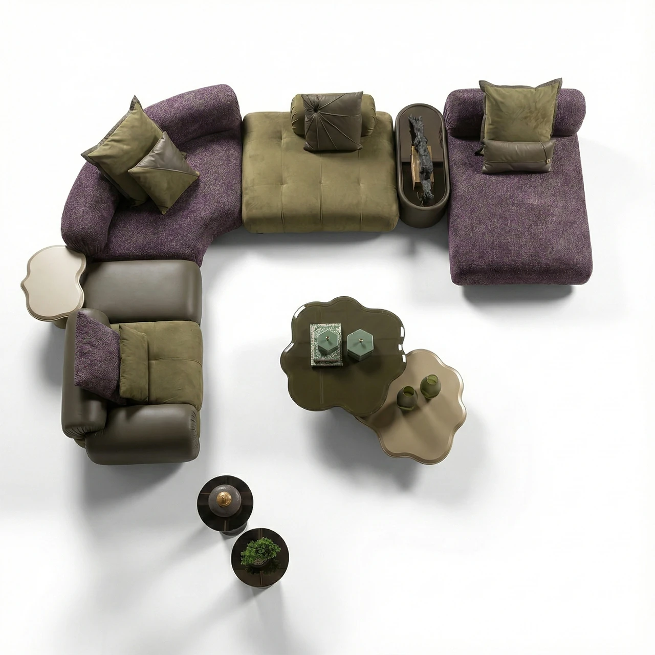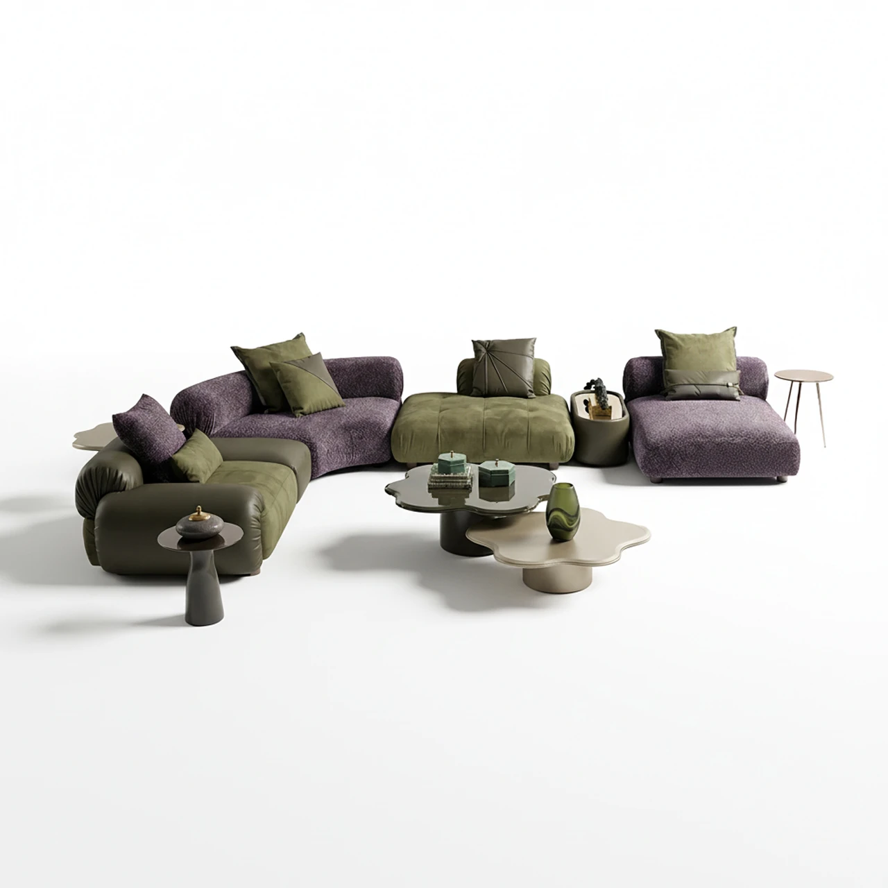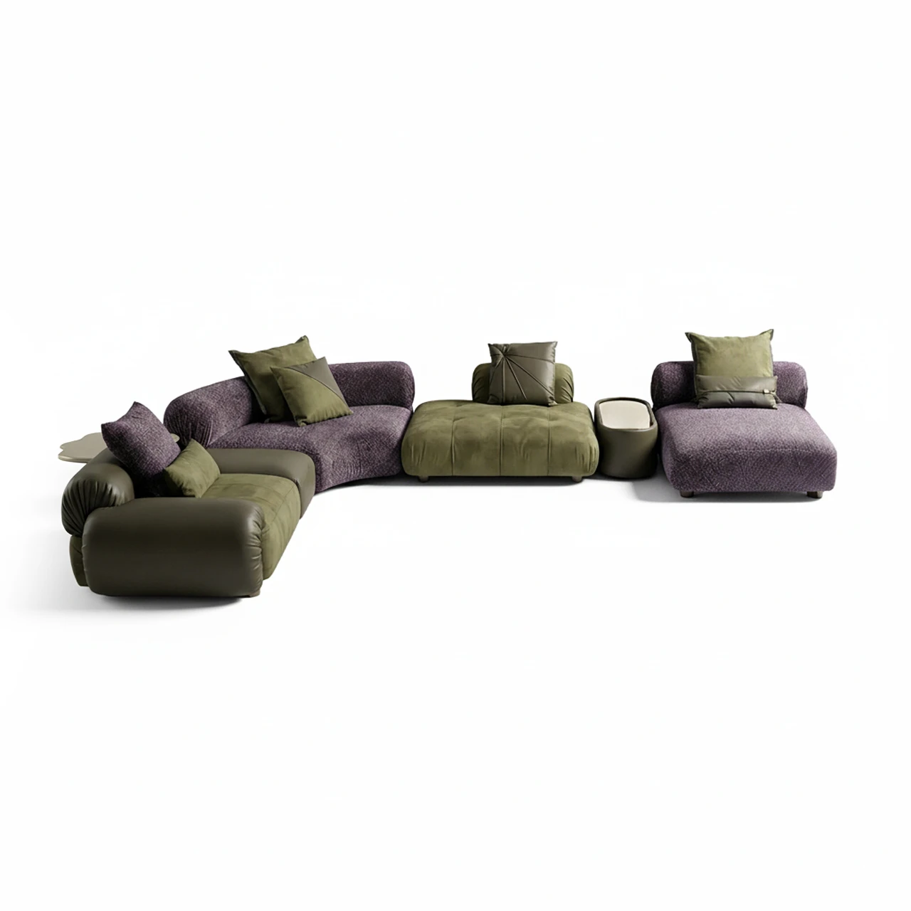 Ferhat Berbercan Mobilya koleksiyonunun en iddialı parçalarından biri olan Verde Modüler Köşe Kanepe, modern yaşam alanlarında sıradanlığa meydan okuyan organik ve kavisli formu ile dikkat çekiyor. Doğadan ilham alan renk paletinde, derin mürdüm rengi özel dokulu şönil kumaş ile haki yeşili premium nubuk dokunun kusursuz birlikteliği, tasarıma çok boyutlu bir derinlik kazandırır.
