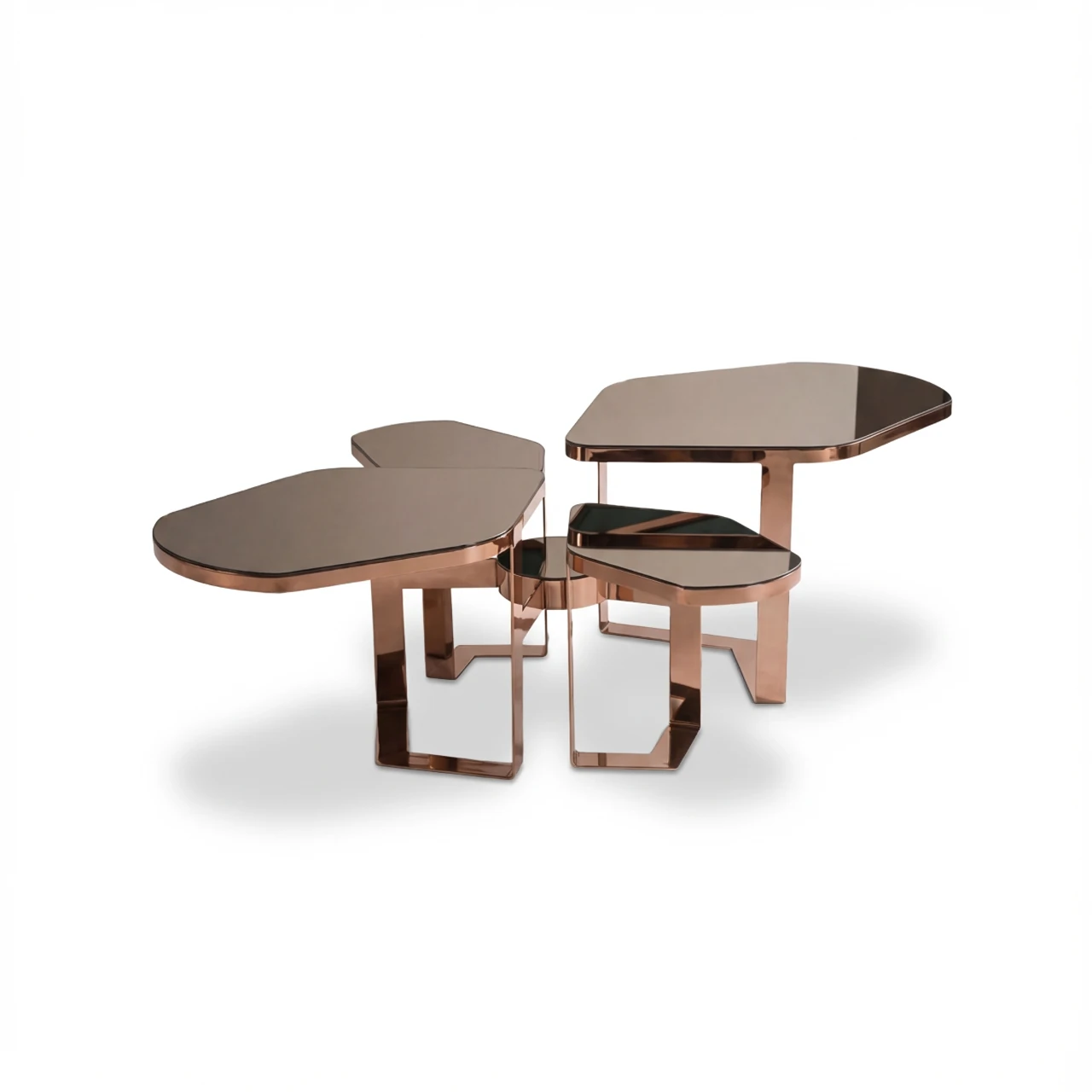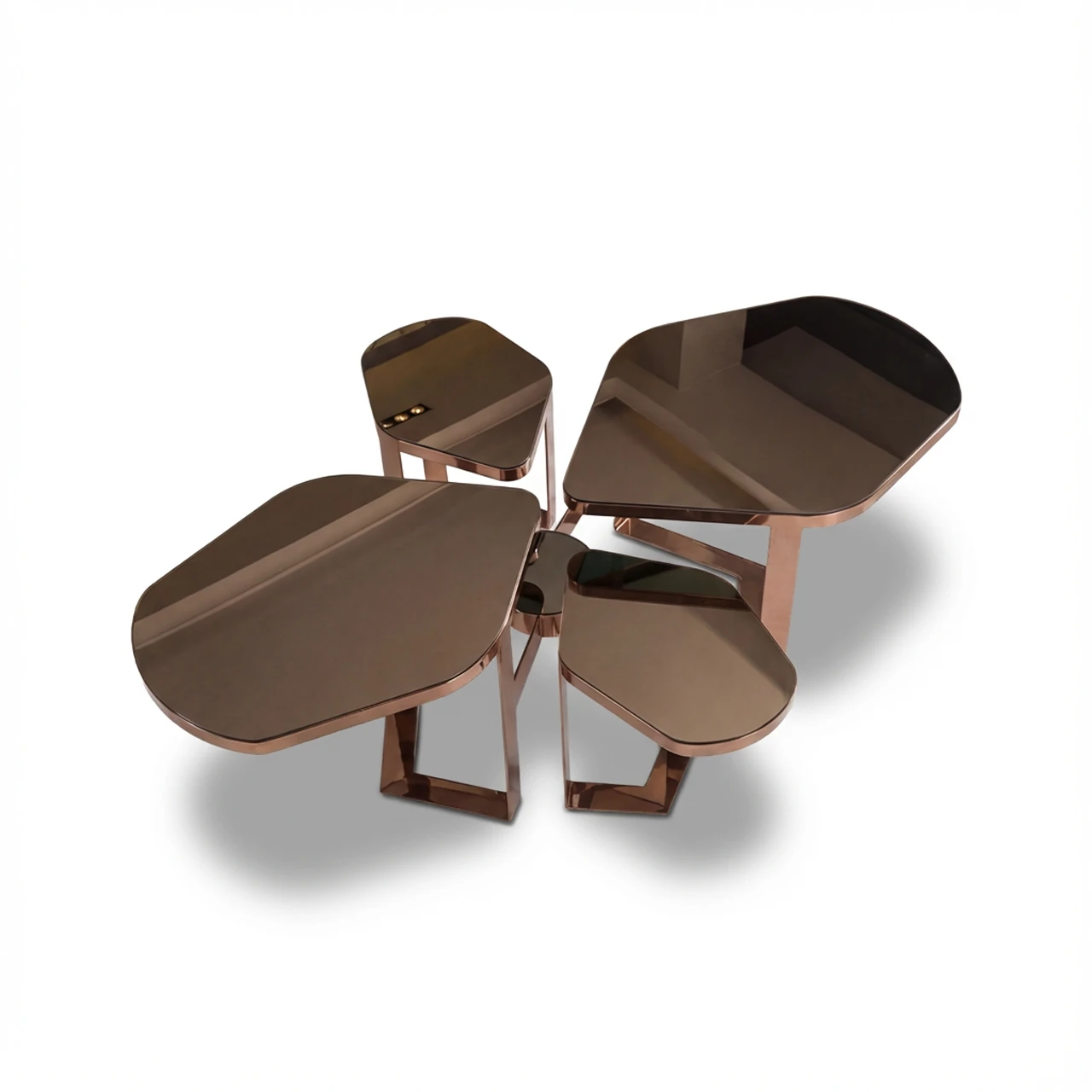 Ferhat Berbercan Mobilya’nın “bespoke” tasarım anlayışıyla hayat bulan Yaprak Orta Sehpa, doğanın kusursuz geometrisini modern yaşam alanlarına taşıyor. Birbirini tamamlayan çoklu katmanlı yapısı, mekanınıza derinlik ve dinamizm katmak için kurgulandı. Üst yüzeylerde kullanılan yüksek kalitedeki bronz ayna, ışığı yumuşatarak odaya sıcak ve zengin bir atmosfer yayarken; ayaklardaki rose gold metal kaplama, tasarımın mücevher niteliğindeki ışıltısını tamamlıyor.