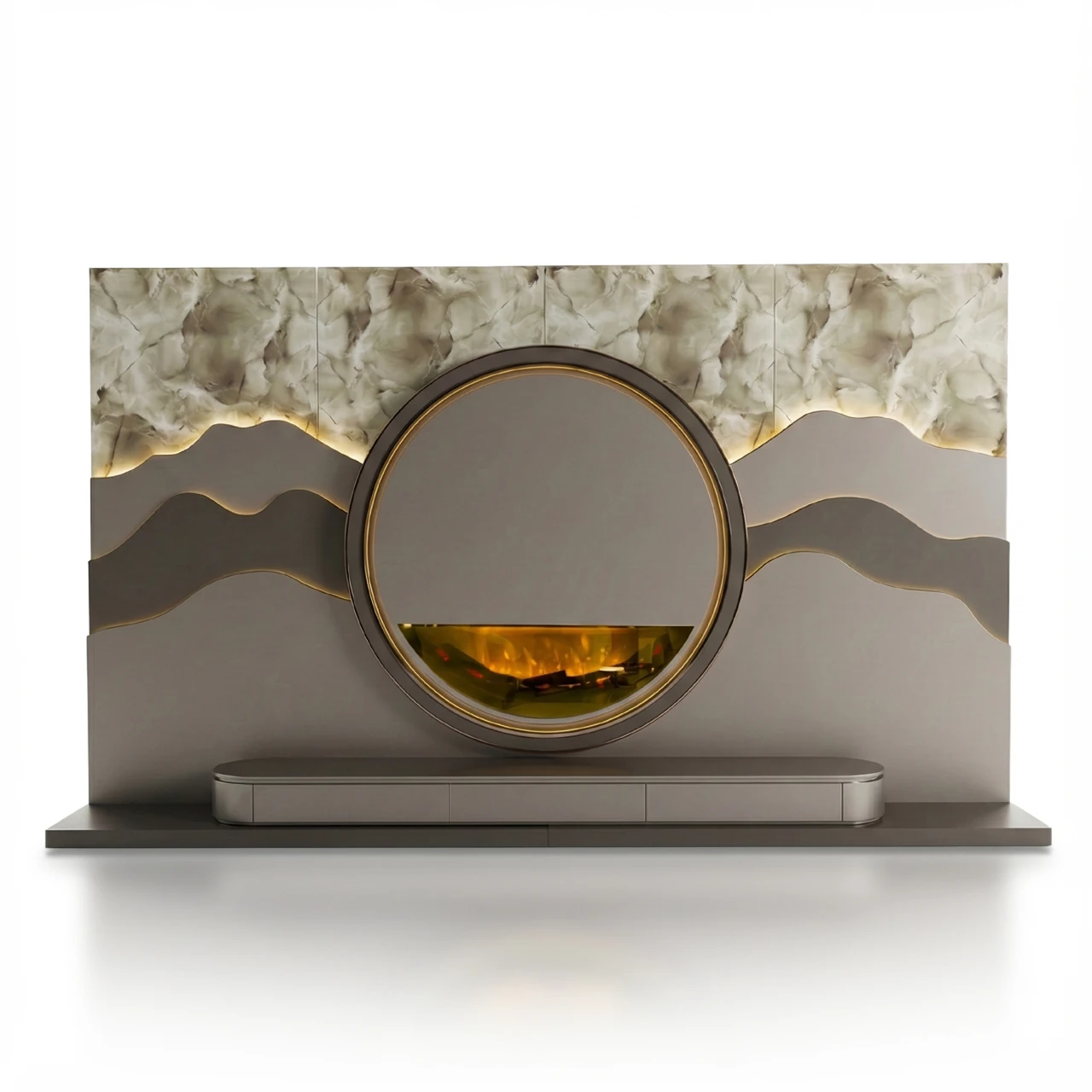 Tasarımın kalbinde yer alan ve altın/pirinç çerçeve ile belirginleştirilen dairesel modül, içerisinde barındırdığı entegre şömine haznesi ile mekanın sıcaklığını artırırken, modern İtalyan tasarım çizgilerini evinize taşıyor. Alt blokta yer alan kapsül formundaki medya ünitesi, keskin köşelerden arındırılmış yumuşak hatları ve işlevsel depolama alanları ile hem estetik hem de ergonomik bir kullanım sunuyor. Bu “bespoke” tasarım, özellikle geniş salonlarda odak noktası oluşturmak için idealdir.