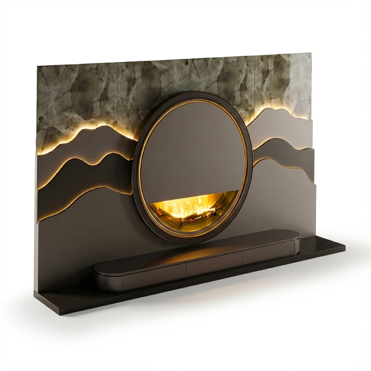 Doğal taş dokusunun arkadan aydınlatmalı katmanlı organik formlarla buluştuğu Yaprak TV Ünitesi, entegre şöminesi ve dairesel merkez odağıyla yaşam alanlarınıza sanatsal ve sofistike bir atmosfer katıyor.